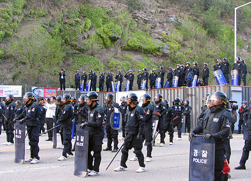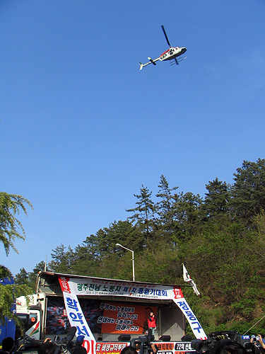 当初この日大会は現代ハイコス工場前で行われる予定だったが、警察の封鎖で工場正門から6kmほど離れた進入路で開催された。