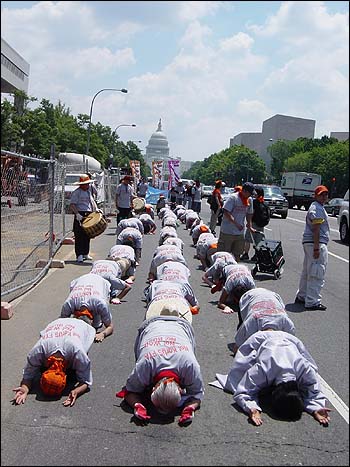 7日、遠征デモ隊は民主党下院議員デニスクチニチと共に、FTA反対記者会見を持った。記者会見を終えたデモ隊は議会前の芝生で三歩一拝を始め、ホワイトハウス前の自由広場(Freedom