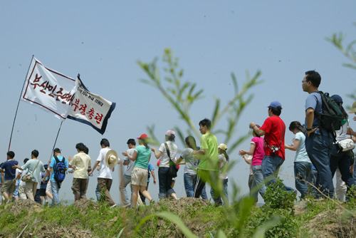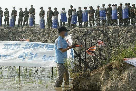 一方、参加者達は警察の沮止線を避けて行進し、途中鉄條網に平和を象徴する布などを付けて、「'在韓米軍撤収」 などを叫んだ。