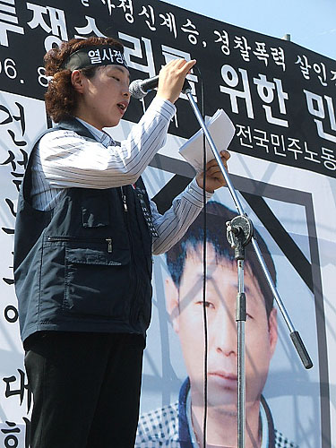 チョ・ジュンホ民主労総委員長は「ハズングン烈士を絶対そのまま送ることができない」、「暴力警察と殺人政権が不正規職労動者たちを踏みつぶしている。保守言論が事態を歪曲している」と怒った。チョ・ジュンホ委員長は「建設労動者の正当な要求である週5日勤務と留年休日主張に対してノ・ムヒョン政府は返事しなさい」といい、「まだハズングン同志の追悼辞をする時ではない、勝利するまで力強く闘争しよう」と言った。