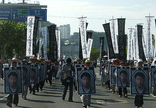 決意大会参加者達は決議文を通じて △殺人暴力集団警察庁長官と現場責任者処罰 △ノ・ムヒョン大統領お詫び △再発防止対策樹立 △建設労組への公安弾圧中断と損賠仮押撤回、拘束者釈放