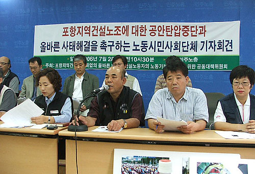 民主労総、民主労動党、民主言論労組、民主弁護士会など労動社会団体が「浦項地域建設労組ストライキの正しい解決と建設労動者の労動権保障のための共同対策委員会」を発足して、28日午前11時民主労総で記者会見を持った。