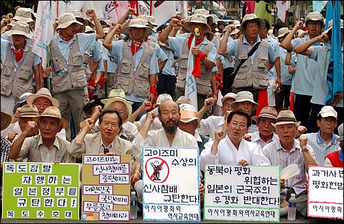 統一連帯など130余個の市民社会団体で構成された対日行動ネットワークは、15日、 日本大使館隣近である国税庁の前で 2000人余りが参加し、「日本の軍事化・右傾化糾弾共同行動」を通じて小泉総理の靖国神社参拝と日本の歴史歪曲を批判した。