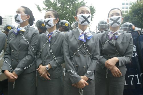 | 労働部の調査発表の前日、鎖で体を結び、記者会見をしているKTX乗務員たち。 |