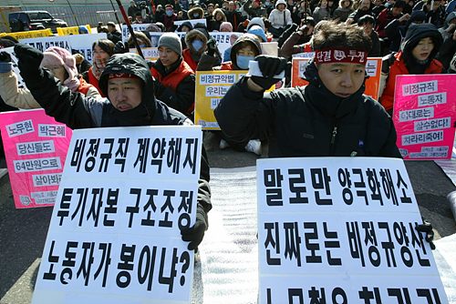 民主労動党も緊急記者会見を通じて「非正規職問題は労動問題の以前に深刻な民生問題」、「巨大両党が強行処理しようとする非正規職法案は非正規職の増加を制度化させる労動悪法」、「立法の一番基礎的な同意過程を欠けたまま、大きな社会的抵抗が予見される立法を強行することは、公党の基本責務を忘れることだ。非正規職労動者の生を悽惨に踏み付ける権利をどんな国民も国会に委任したことない」と強行処理を糾弾した。