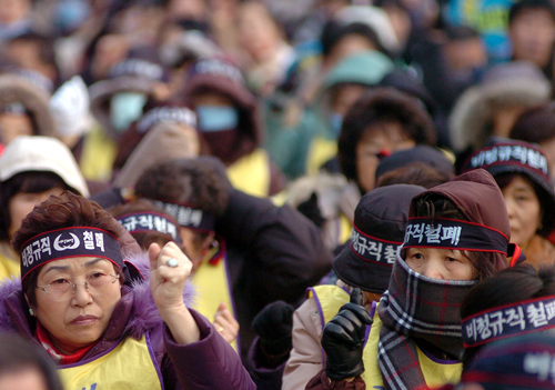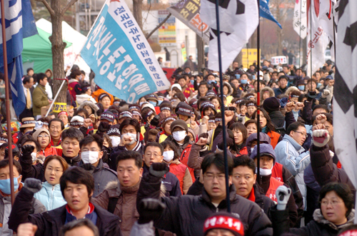去る11月30日、国会本会議で非正規職関連法案が強行処理された以後、民主労総は1日から激しい街頭デモに出た。 5日には「非正規職法改悪の全面無效と労動法改悪阻止のためのゼネスト大会」を開いた。