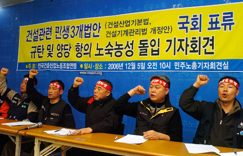 建設産業連盟傘下建設運送労組ダンプ、レミコン、タワークレーン運動記者労組、土木建築協議会など建設労動者たちが建設関連民生法案の早速な処理を促して、ウリ党とハンナラ党の前で無期限路宿座り込みに入った。