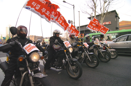 行進の先頭にはクイックサービ労働組合所属の労動者たちが、バイクに「韓米FTA 無效」と書かれた旗と 「NO 韓米FTA」などの宣伝物をつけて行進参加者達を先導し、視線を集めた。