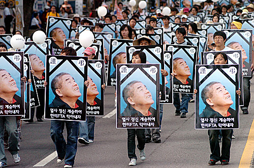 韓米FTA阻止汎国民運動本部は、2日、ホセウク烈士の49日目追悼式、韓米FTA 全面無效の総決起宣布大会を開催した。参加者達は「ホセウク烈士の希望は韓米FTA廃棄だ」と強調し、「さらに強い闘いで立ち上がることを決意する席」として、この日の大会の意味を改めて確認した。