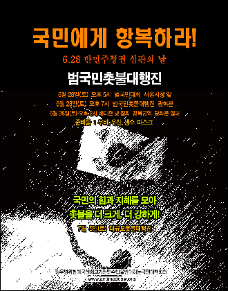 狂牛病国民対策会議は29日を「反民主政権審判の日」であると名付けて、昼から集会を行うという計画だ。午後2時からはネット掲示板「アゴラ」を中心に提案された行動が、景福宮駅を含めた光化門一帯で進行される。午後 5時からはソウル市役所の前で、午後7時からは光化門で集会が公知された。