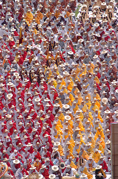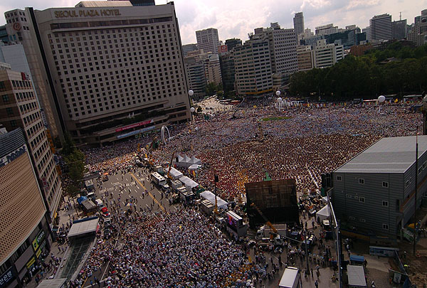 李明博政府の「宗教偏向」を糾弾すると飛び出た仏教徒たちが、ソウル広場を踏み場のないくらいにいっぱい埋めた。