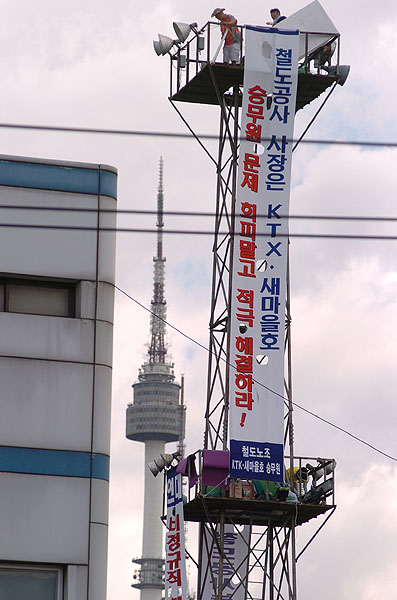 呉美善KTX乗務支部支部長を含めむ5名は、ソウル駅付近40余メートル高さの照明鉄塔に上がって座り込み中であり、直接雇用要求が受け入れられるまで無期限座り込みを続くという立場だ。