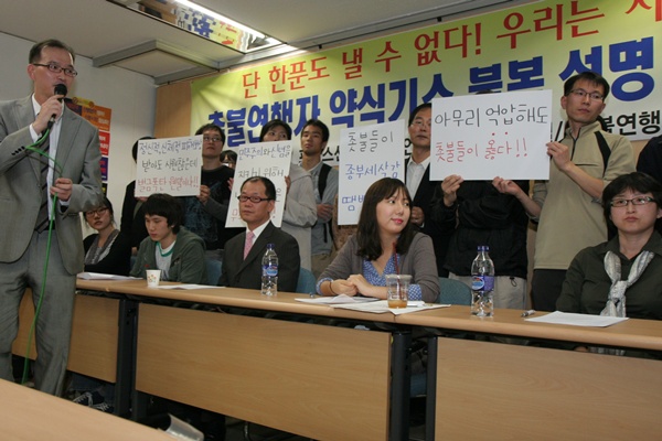 インターネットの集まりであるキャンドル連行者の会は7日、プレスセンターで記者会見を開いて「検察の略式起訴は法的正当性に欠けているし、3.1運動と4.19民主理念を受け継いだ憲法の精神にも合わない」と批判した。