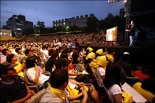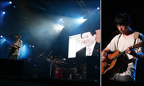 21日午後7時30分。ソウル市クロ区にある聖公会大学にて俳優グォンヘヒョ氏司会でノ・ムヒョン前大統領の追慕公演が始まった。追慕公演のタイトルは「再び風が吹く」。