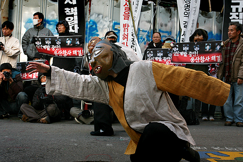 竜山惨事後300日目となる15日午後3時、ソウル竜山区の惨事現場では犠牲者の魂を慰める鎭魂祭り(グット)が開かれた。ソウル、京畿、仁川地域の9つのプンムルチームで構成された「竜山惨事解決を念願する首都圏プンムルペ連帯」の協力によってこの日のグッドにはカンデノリとタルチュム(仮面舞)など盛りだくさんの行事が続いた。