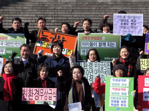 全教組ソウル支部と生協団体ハンサルリム、生態乳児共同体など24個の教育市民団体で構成されるソウル親環境無償給食運動本部は、18日ソウル光化門で記者会見を開いて、「子供達の健康と幸せが実現するようにするために、来る5月までソウル市民50万名の署名を目標に親環境無償給食汎国民運動を展開する」と明らかにした。