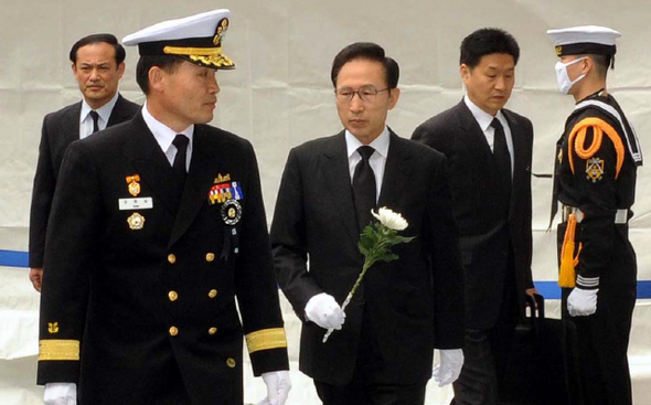 李j大統領は海軍関係者たちと握手した後、訪問録に「大韓民国はあなたたちの貴い犠牲を決して忘れないだろう」と書いた。李大統領は弔問後、東大門市場をまわりながら、「今度の事で後退するのではなくもっと進むきっかけにしなくてはならない。若い人々もそうで…」と言ったりした。
