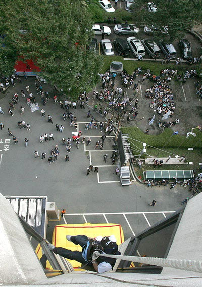 イサンギル社会連帯年金支部の支部長はこの日、8階高さの国民年金管理公団の屋上から綱に乗って下り、高空デモに突入した。
