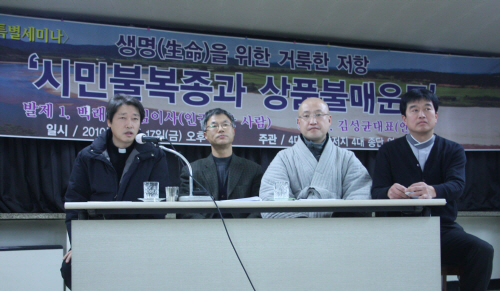 4大宗団連帯」は17日、明洞カトリック会館大講堂で「生命のための崇高なる抵抗」という主題のセミナーを開いて「李明博政権が生命の4大河を破壊するのに貴重な国家予算を駆って使うために暴力的な方法で新年予算案を通過させて民主主義を踏み躪った」、「李明博政権とその下手人になったハンナラ党を生命と平和を抹殺する勢力で規定」し、これらに対する抵抗を決意した。