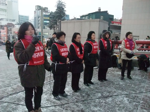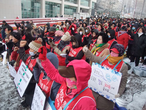 4時、弘益大学の正門前では「2次集団解雇ソギョン支部組合員集中集会」が開かれた。約1000名の会員たちが冷たい風と雪の中、弘益大学の掃除労動者たちとの連帯のために集まった。学生と労働者の間の葛藤が憂慮されてきたが、今回の集会には単科大学の覚醒会長が参加するなど変化が見られた。