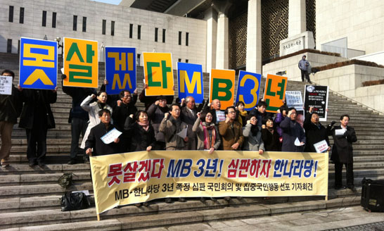 記者会見参加者達は「2月 25日、李明博政府就任 3周年、2月臨時国会開院を控えている今。国民的怒りを集めて野党と市民社会団体はソウル駅で『MB-ハンナラ党