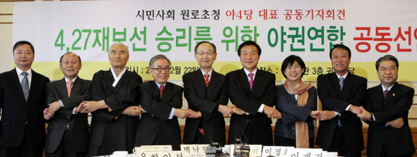 4党代表と市民社会元老たちはこの日記者会見を開いて、共同宣言文を発表した。彼らは宣言文で「民主進歩陣営は李明博政府の独走を審判して、より良いデモクラシーと民生安定、朝鮮半島の平和を実現するために4·27