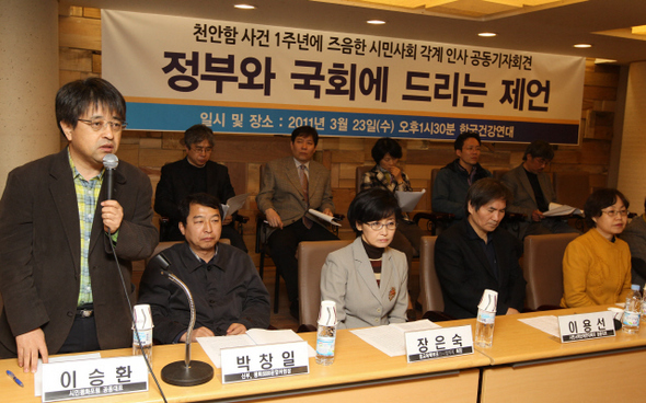 天安艦沈沒事件1年を迎え、言論·教育·法曹·南北関係など市民社会の各界人士が共同記者会見を開いて、政府と国会に天安艦隊沈沒の原因に対する追加調査及び検証と南北対話の再開など