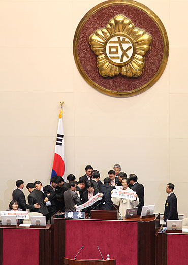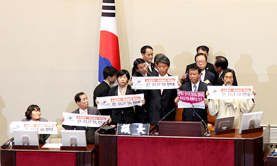 4日夜11時頃、韓国-EU FTA批准同意案が民主党の黙認の下、本会議に上程されてハンナラ党が単独で通過させた. 民主労動党と進歩新党議員
