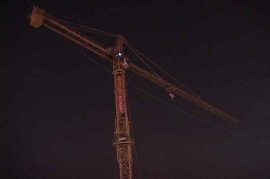 整理解雇撤回を要求して韓進重工業ヨンド造船所の17号タワークレーンの上で座り込みをして来たチェギルヨン韓進重工業支会長とムンチォルサン金属労組支部長が11日夕方、高空座り込み