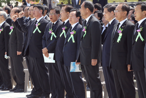 この日の記念式には与・野党政治家が大挙参加したが、李明博大統領が参加しなくて議論が起こった。