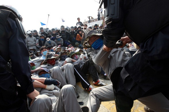 労組員たちが勤務制と給与体系変更を要求して一週間工場を占拠したままストライキを行っている忠南牙山市ユソン企業に、 24日午後4時頃戦闘警察の兵力が投入された。