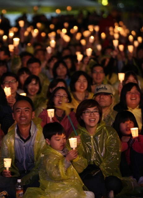 ソウル広場の追慕文化祭では、参席者たちは暗くなると紙コップに盛られたキャンドルを置き、雨が降ったら真っ黄色いレインコートで着飾った。