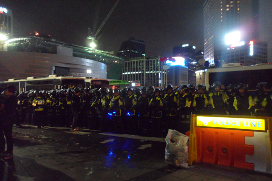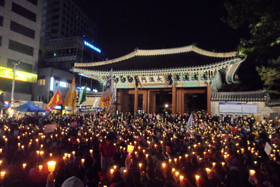 最初キャンドル集会はソウル市長広場で開かれる予定だったが、警察バスと警察が阻んでいて大韓門の前で開かれた。
