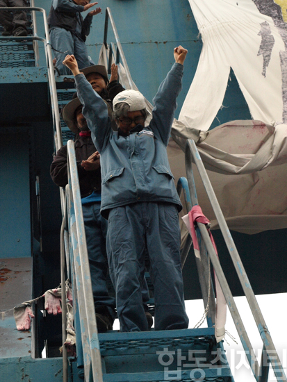 前日、韓進重工業労組は、@整理解雇者94名を一年以内に再雇用A解雇者一人当たり約200万円の生計費支給 B双方による告訴・告発取り下げなどを内容とする労使合意案を満場一致で可決して、キムジンスクと4人の85号クレーン高空座り込みを終了したのである。