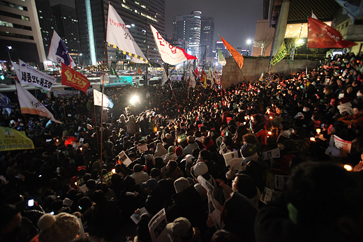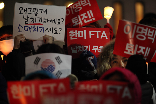 22日韓米FTA 批准の強行採決後 5日が経ったが、労動者、市民たちの批准無效要求は続いている。