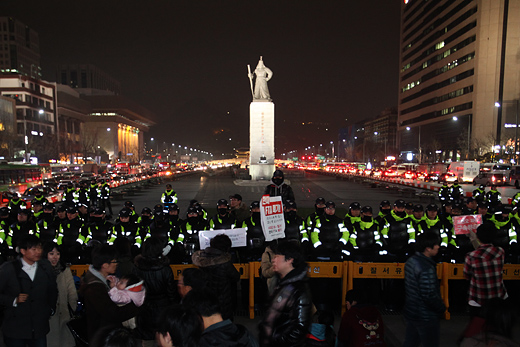 キャンドル集会に参加するため市民たちが集まると、警察は光化門に至る道に封鎖し、広場進入を遮断した。