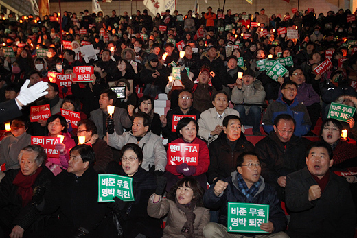 午後 6時 30分頃、韓米FTA凡国民本部と市民 3千余人は、キャンドル集会を始めた。これには民主党議員など野党議員も大挙参加した。
