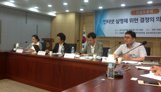 チェ·ジェチョン議員室と言論改革市民連帯、進歩ネットワークセンター、参与連帯はインターネット実名制違憲判決を迎え、30日午後、国会議員会館で「インターネット実名制違憲決定の意味と今後の課題の緊急討論会」を開き、今回の違憲判決の意味と今後の課題を点検する意見を交換した。