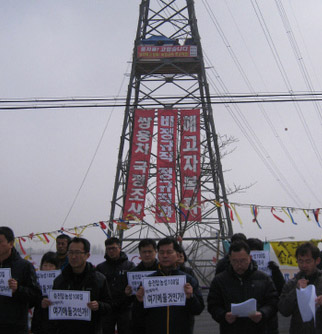 籠城中の労働者たちは昨年11月20日、高さ41mの送電塔の中間に支持台を設置し真冬の厳寒の中で一日二食で耐えている。