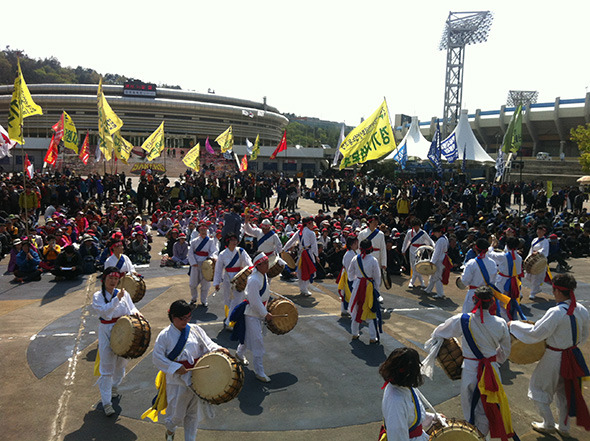 これらの人々は慶南道庁まで2kmほどを街頭行進した後、慶南昌原市義昌区士林洞(サリムドン)の慶南道庁前の路上で全国労働者大会を開いた。