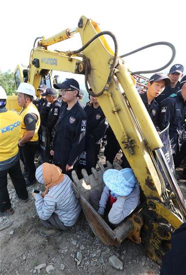 住民たちは工事を阻むために掘削機の下へ潜って綱で掘削機と体を縛りつけて抵抗した。