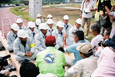 那覇防衛施設局の職員に、基地建設反対を訴える(辺野古)