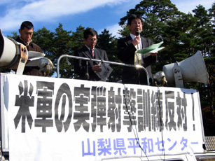 「日米地位協定によって米軍は、北富士演習場を自由に使用することができる。これは北富士に米軍基地があるのと同じことだ。在沖縄海兵隊の実弾射撃訓練は第1回目が97年7月に行われた。今年で9年、7回目の演習となる。今回は11月4日から16日まで13日間行われ、このうち9日間射撃訓練が行われる。参加している海兵隊員は180人、155ミリ砲は6門、車両は40両だ。恒常化しつつある海兵隊の演習に対して、平和センターは強く抗議する。」