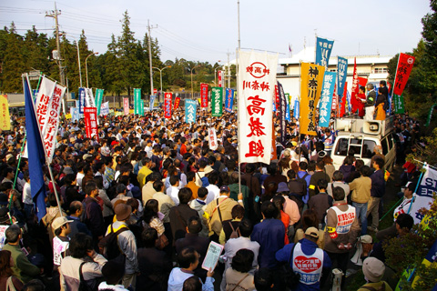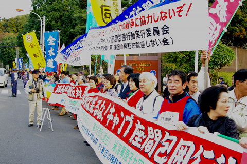 集合会場となった座間消防訓練場駐車場では、14時から集会が開かれ、神奈川平和運動センター代表の宇野峰雪さん、民主党の斉藤つよしさん、社民党の福島瑞穂さん、神奈川ネット事務局長の伊知地富美枝さんから、包囲行動の成功を目指して発言が行われました。