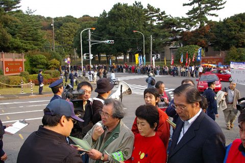 キャンプ座間ゲート前。包囲行動と同時に、在日米軍へ抗議の申し入れをおこなった。