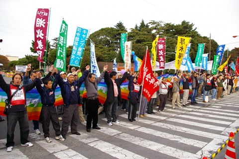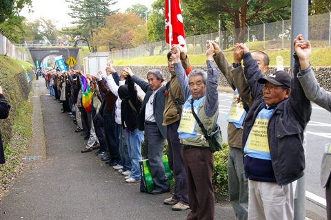 「キャンプ座間」包囲行動が11月13日(日)に行われ、全国各地から平和フォーラム加盟組織や市民団体がが参加しました。包囲行動を主催したのは、神奈川平和運動センター・キャンプ座間への米第1軍団の移駐を歓迎しない会・基地撤去をめざす県央共闘会議でつくる実行委員会です。キャンプ座間の包囲行動は本年2月19日についで2度目になります。