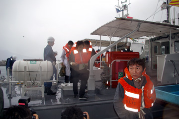 上右:海上保安庁の巡視艇のって避難する、原発周辺の住民