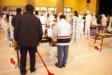 下右:避難した住民は、放射能に汚染されていないかチェックを受ける。