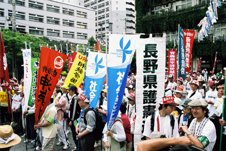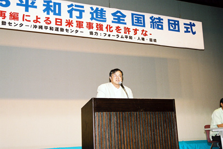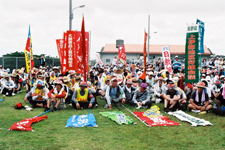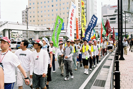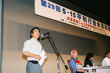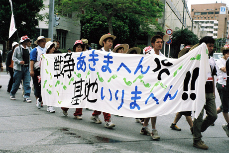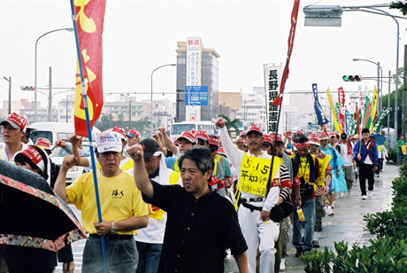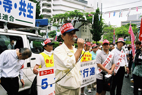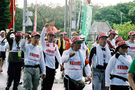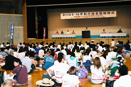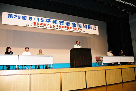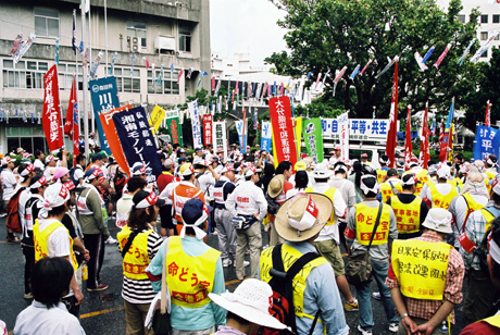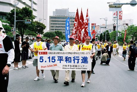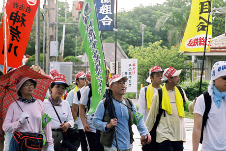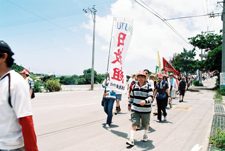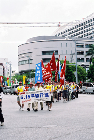 沖縄県の本土復帰から34年目をむかえる今年も、沖縄平和運動センターが主催する「5.15平和行進」が開催されました。5月11日には結団式が行われ、12日から14日まで3コースに分かれて行進、また14日には県民集会が開かれました。