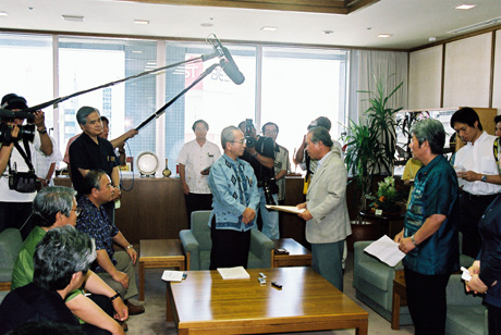 ●牧野浩隆副知事に、抗議文を手渡す、山内徳信共同代表。